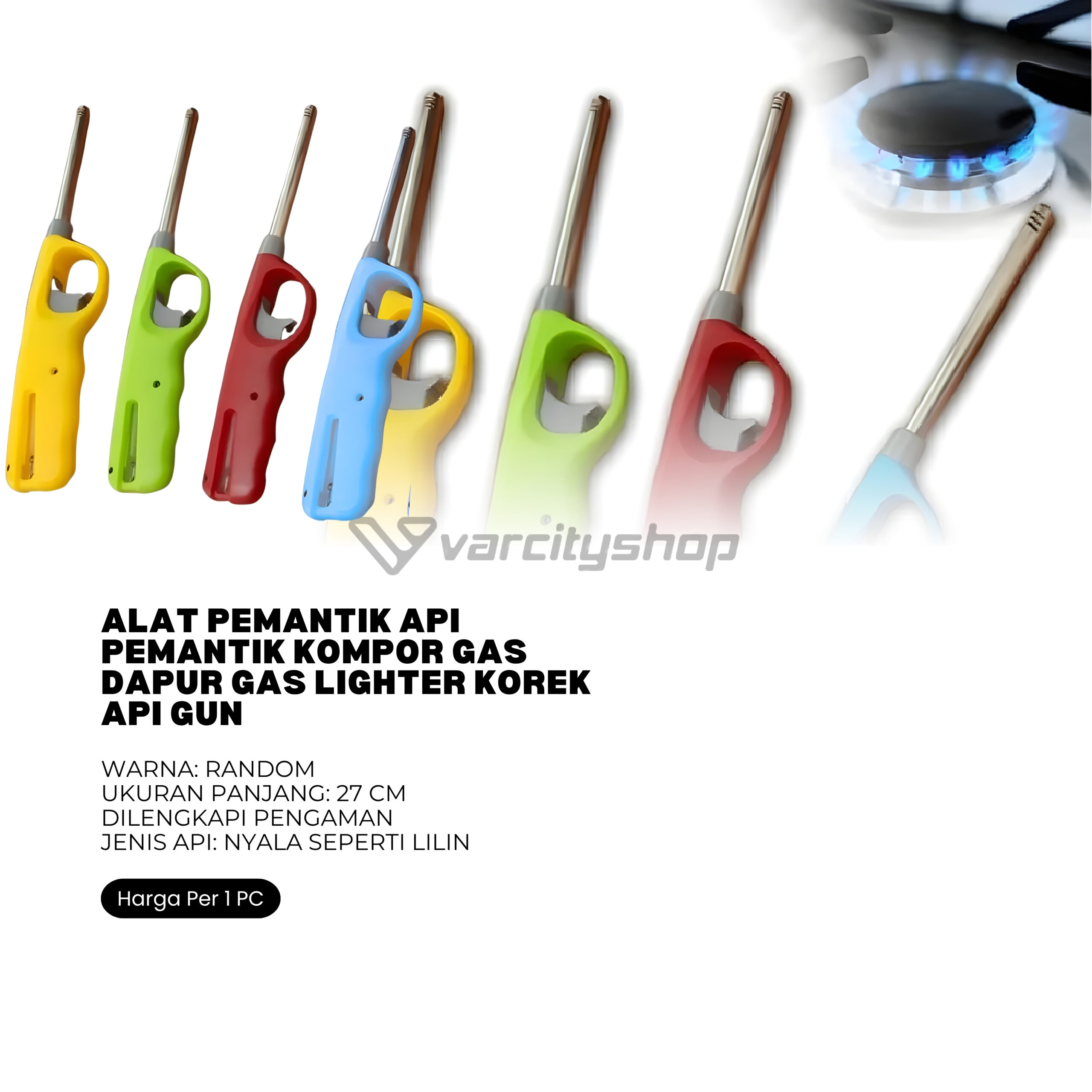 Alat untuk menyalakan api kompor gas, oven gas atau kompor minyak tanah. Mudah penggunaanya dan dilengkapi dengan Safety Lock untuk menghindari anak-anak bermain api.