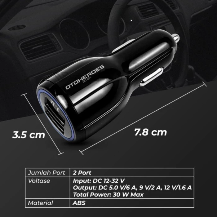Car charger ini terdiri dari 2 port charger USB yang bisa digunakan untuk mengisi daya 2 smartphone sekaligus. Menggunakan plug cigarette ergonomis dengan detail khusus yang tidak mudah lepas saat dipasang. Bagian depannya juga dilengkapi lampu indikator LED untuk memantau proses pengisian daya selama perjalanan. Cocok untuk Anda yang sedang traveling atau akan perjalanan jauh menggunakan mobil.