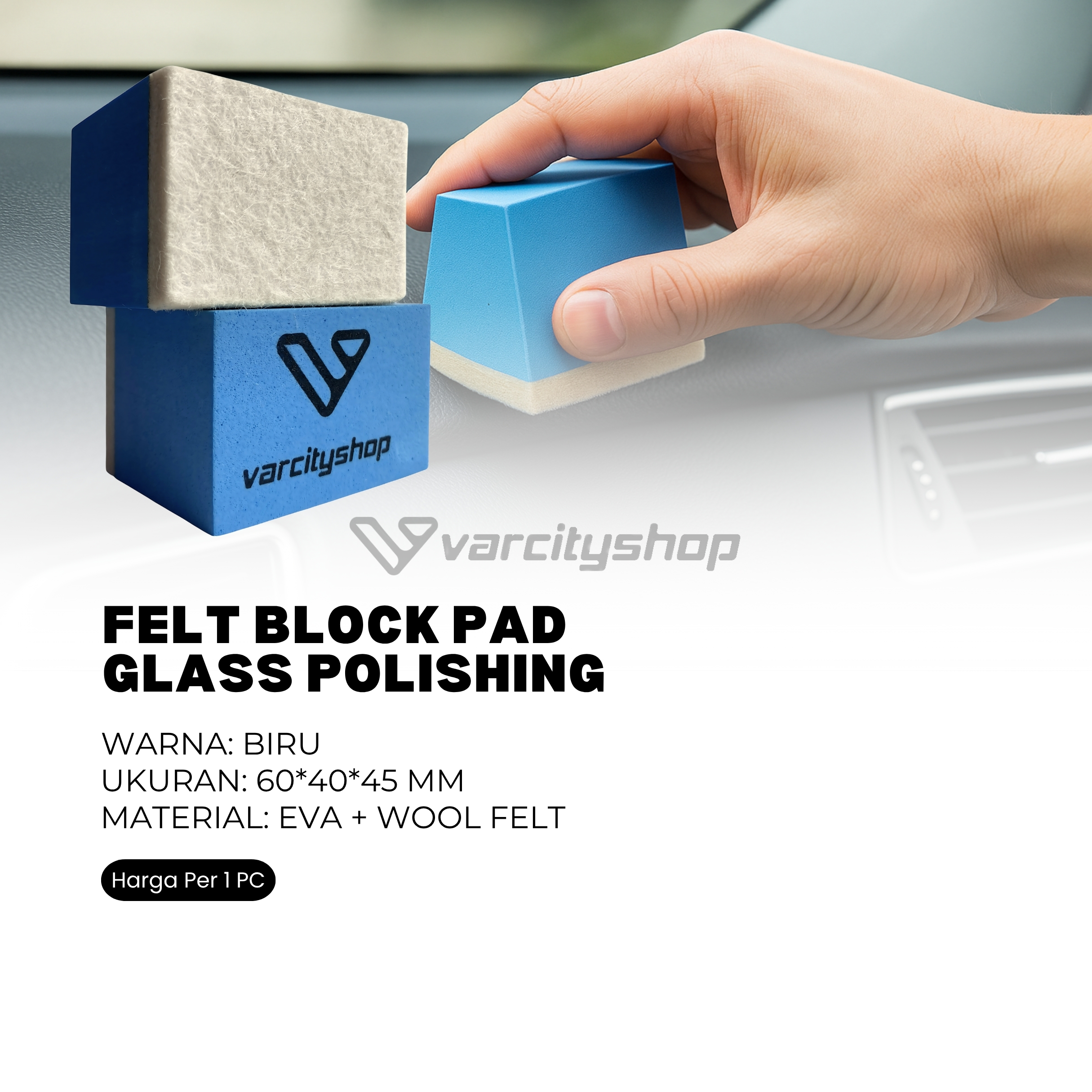 Glass Felt Block adalah aplikator poles untuk kaca manual untuk menghilangkan jamur kaca atau kotoran lainnya. Berbentuk kotak sehingga dapat menjangkau hingga kesudut dibanding glass felt berbentuk bulat. Terbuat dari wool yang dipadatkan aman pada kaca dan tidak mudah rusak. Nyaman digenggam dan tidak licin