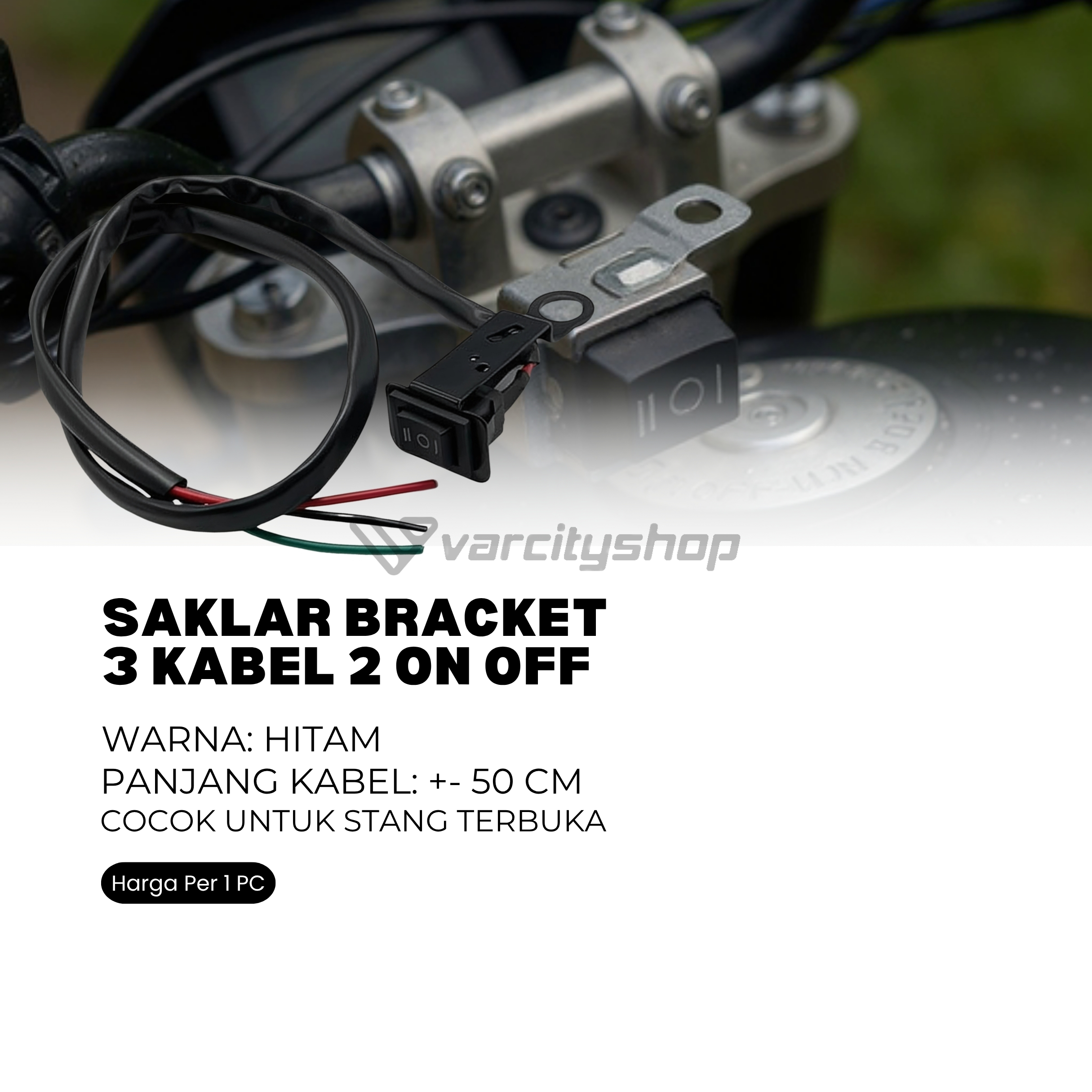 Saklar external untuk motor yang ekonomis dan tahan segala macam cuaca. Dengan bahan ABS Plastic dengan bracket berbahan besi.Saklar memiliki 3 kabel yang biasa diggunakan untuk lampu tembak yang juga memerlukan 3 kabel saklar bisa juga sebagai lampu jauh,lampu dekat,dan lampu mati