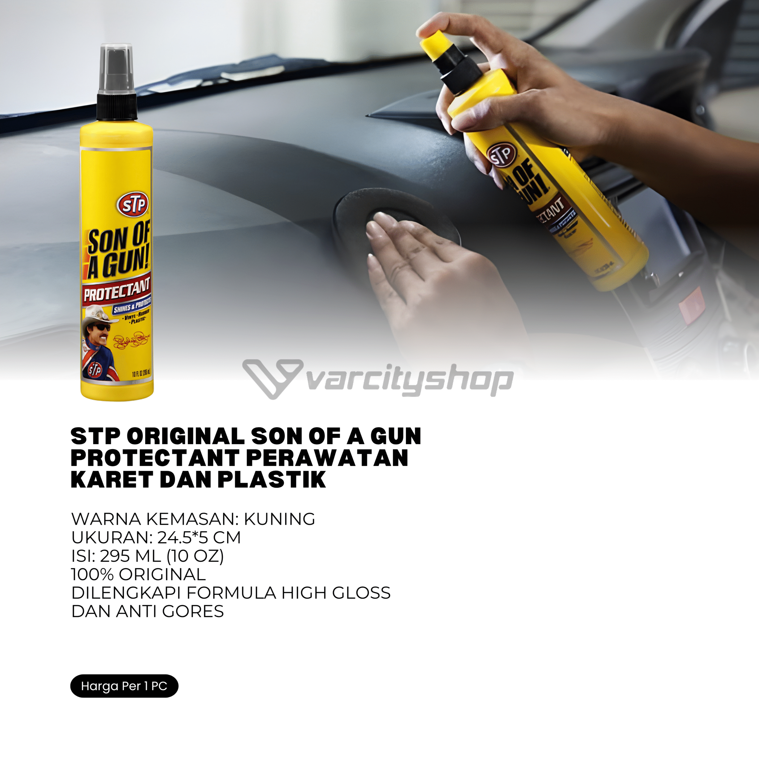 STP SON OF A GUN ! PROTECTANT adalah cairan perawatan, pelindung, pembersih, dan pengkilap permukaan karet / Rubber, Vinyl, Kulit, dan Plastic. STP SON OF A GUN ! PROTECTANT mengandung formula Polymer Silicone unik yang dapat dengan mudah diserap untuk membuat kesan kilap dan melindungi permukaan karet / Rubber, Vinyl, Kulit, dan Plastic.