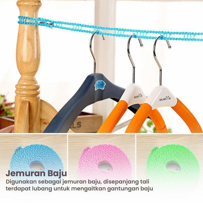 Bisa juga digunakan di dalam ruangan sebagai tali gantungan baju atau dibawa untuk berpergian dan saat berkemah di alam luar.